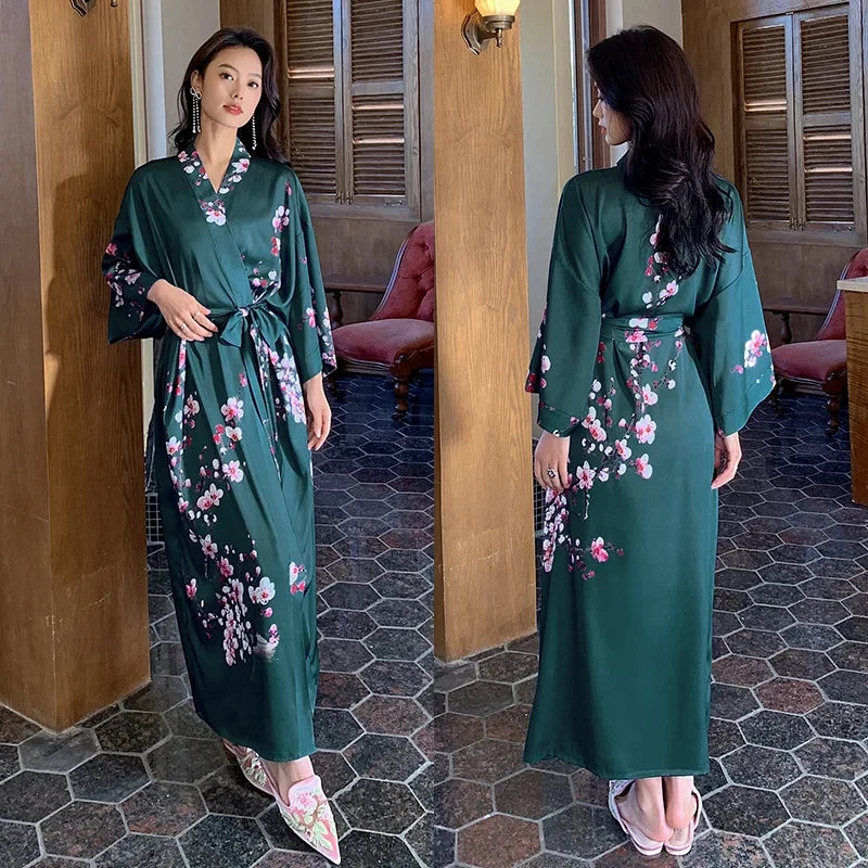 Robe de Chambre Femme Satin Bordeaux Kimono Fleuri Cerisier